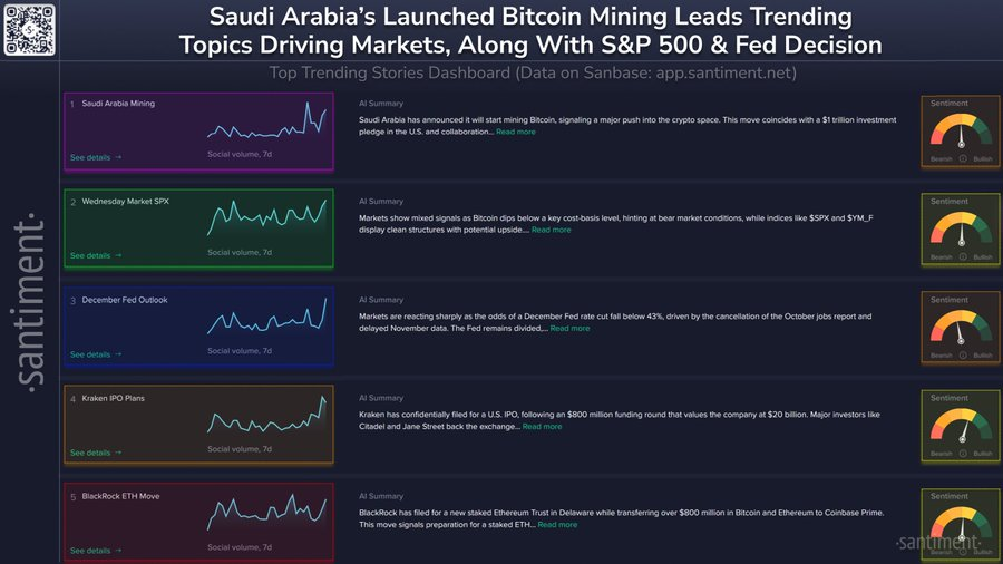 %{{tag.tag}} {{articledata.title}} {{moment(articledata.cdate)}} @{{articledata.company.replace(" ","")}} comment - Saudi Arabia's Bitcoin mining plan and major AI investments are boosting global crypto sentiment and reshaping market expectations - Fed uncertainty and mixed U.S. market signals are limiting momentum even as traders monitor December's crypto legislation vote Global crypto markets are responding to a tight mix of political maneuvers, regulatory signals, and large-scale corporate actions , according to new insights from Santiment. Sentiment has remained sensitive as traders react to shifting expectations around U.S. monetary policy and growing geopolitical involvement in digital-asset infrastructure. Saudi Mining Strategy Becomes a Market Driver Saudi Arabia's decision to begin mining Bitcoin (CRYPTO: $BTC ) has emerged as a major catalyst. The move aligns with its $1 trillion U.S. investment pledge and ongoing collaboration with Nvidia and Elon Musk on a 500MW AI supercomputing project. The kingdom's newly reinforced status as a major non-NATO ally strengthens its alignment with U.S. technology interests, placing it closer to the center of future blockchain and AI development. Investors are interpreting the strategy as a long-term attempt to fuse energy production with high-performance computing capabilities. As a result, attention has shifted toward the Middle East's growing influence in digital assets, especially as regional governments accelerate investment in infrastructure that supports mining, AI training, and tokenization initiatives. Fed Signals Cloud Market Structure and Rate Outlook The U.S. Federal Reserve's policy direction is creating fresh uncertainty. The odds of a December rate cut have dropped sharply, with the CME FedWatch tool now showing a 33% probability of a 25-basis-point reduction, down from 50.1% just days ago. Recent minutes from the FOMC meeting indicated that many officials support keeping rates steady due to persistent inflation concerns. Jerome Powell's tone added further pressure. His remarks reinforced the possibility of extended tight policy, which prompted markets to trim expectations for near-term easing. Investors are also reacting to President Donald Trump's push to replace the Fed Chair before Christmas, a move that is injecting political tension into central bank stability. The U.S. dollar index climbed above 100, reaching a six-month high. Treasury yields also stayed firm, with the 10-year note holding above 4.1%. Because of these shifts, analysts are watching key labor data for clues that could influence the rate path into early 2026. Even so, crypto sentiment has improved marginally as lawmakers prepare for an upcoming Senate vote on crypto legislation. The potential approval of a market-structure bill has introduced optimism across digital assets despite broader macro headwinds. Institutional Moves Signal Strategic Adjustments Major players in the crypto industry are positioning for their next phase of growth. Kraken advanced its long-planned public listing by submitting confidential IPO paperwork. Backed by major investors such as Citadel and Jane Street, the exchange targets a 2026 debut and holds an estimated valuation of $20 billion. BlackRock also captured attention as it filed for a staked Ethereum Trust in Delaware and shifted more than $800 million worth of BTC and ETH (CRYPTO:$ETH ) to Coinbase Prime (NASDAQ: $COIN . Analysts interpret the move as preparation for a staked ETH ETF. Meanwhile, broader crypto markets are attempting a partial rebound. Bitcoin trades near $91,650, recovering from a dip to $88,526, and pushing toward the $92,000 mark. Ethereum trades around $3,000, while XRP holds at $2.11. The global crypto market cap rose 1.3% to $3.12 trillion, though volatility remains elevated.
